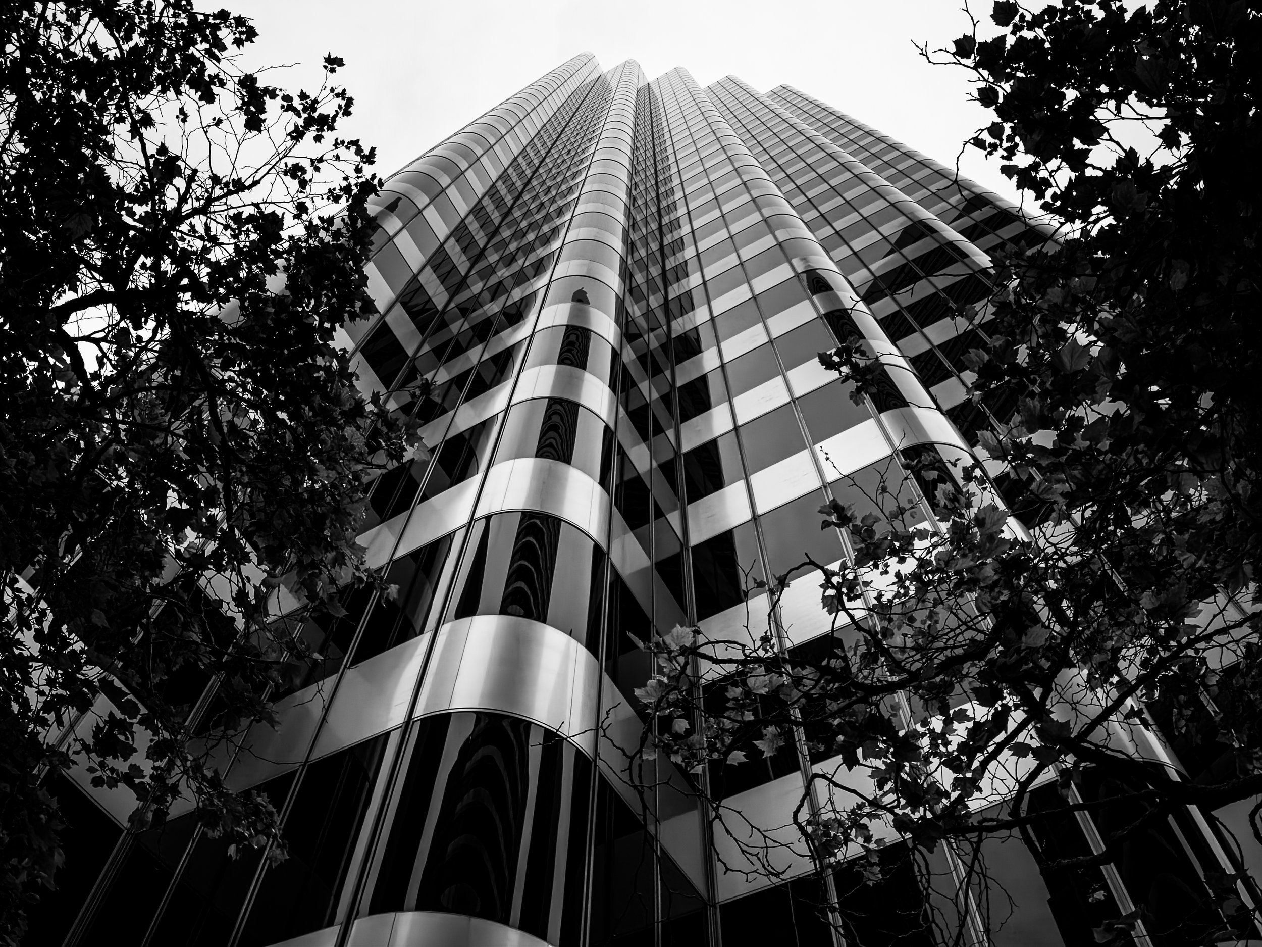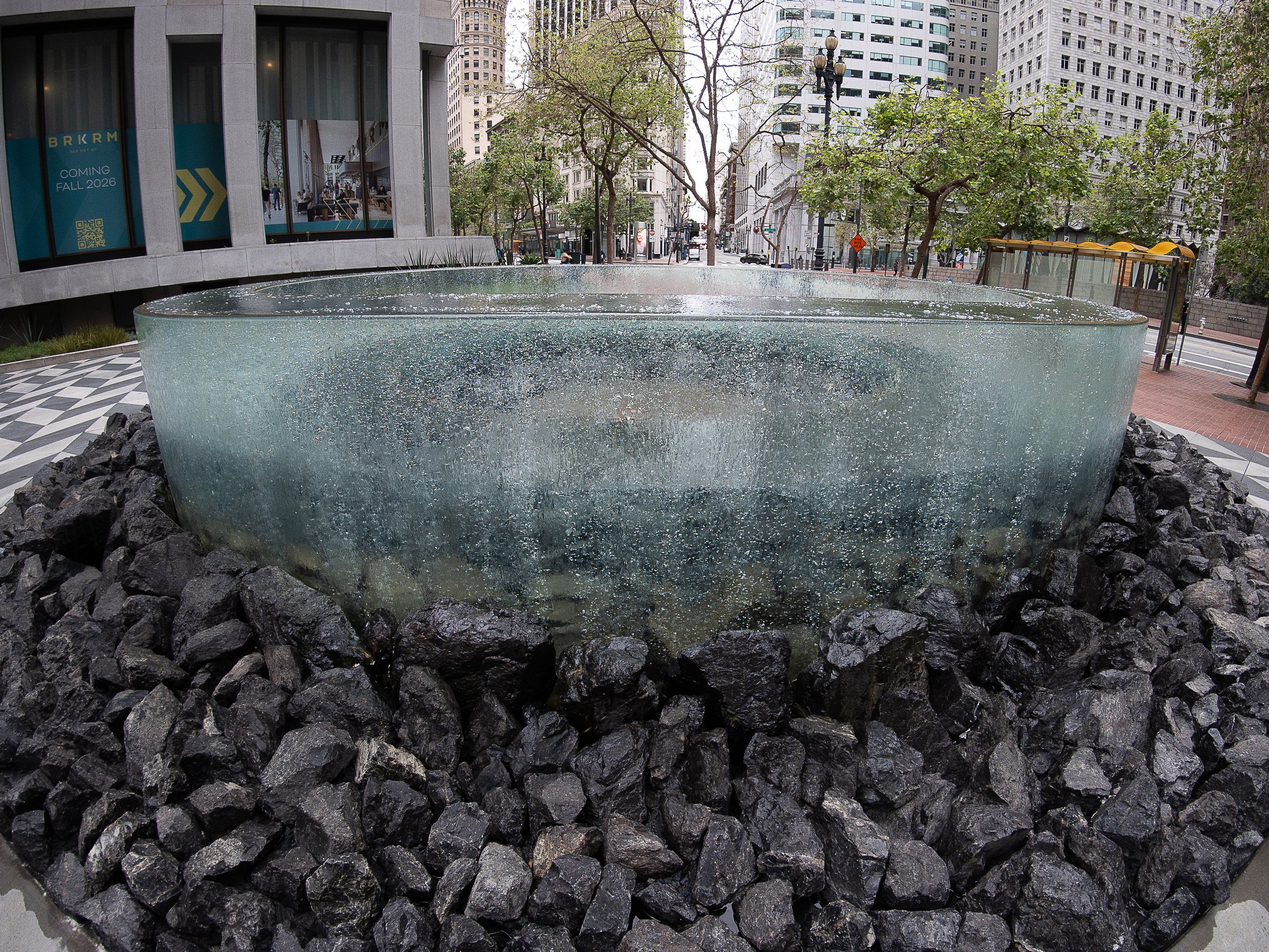 Over in South of Market, I spent some time at 525 Market and worked the circular fountain out front. The wide angle let me get close and still capture the full circle of the fountain in the frame, with the building rising up behind it. Then I moved down to 420 Market to shoot the wavy facade. That building has a really unusual surface, and the Leica lens handled the curves and architectural lines well. I held the camera low and let the geometry of the building fill the frame.