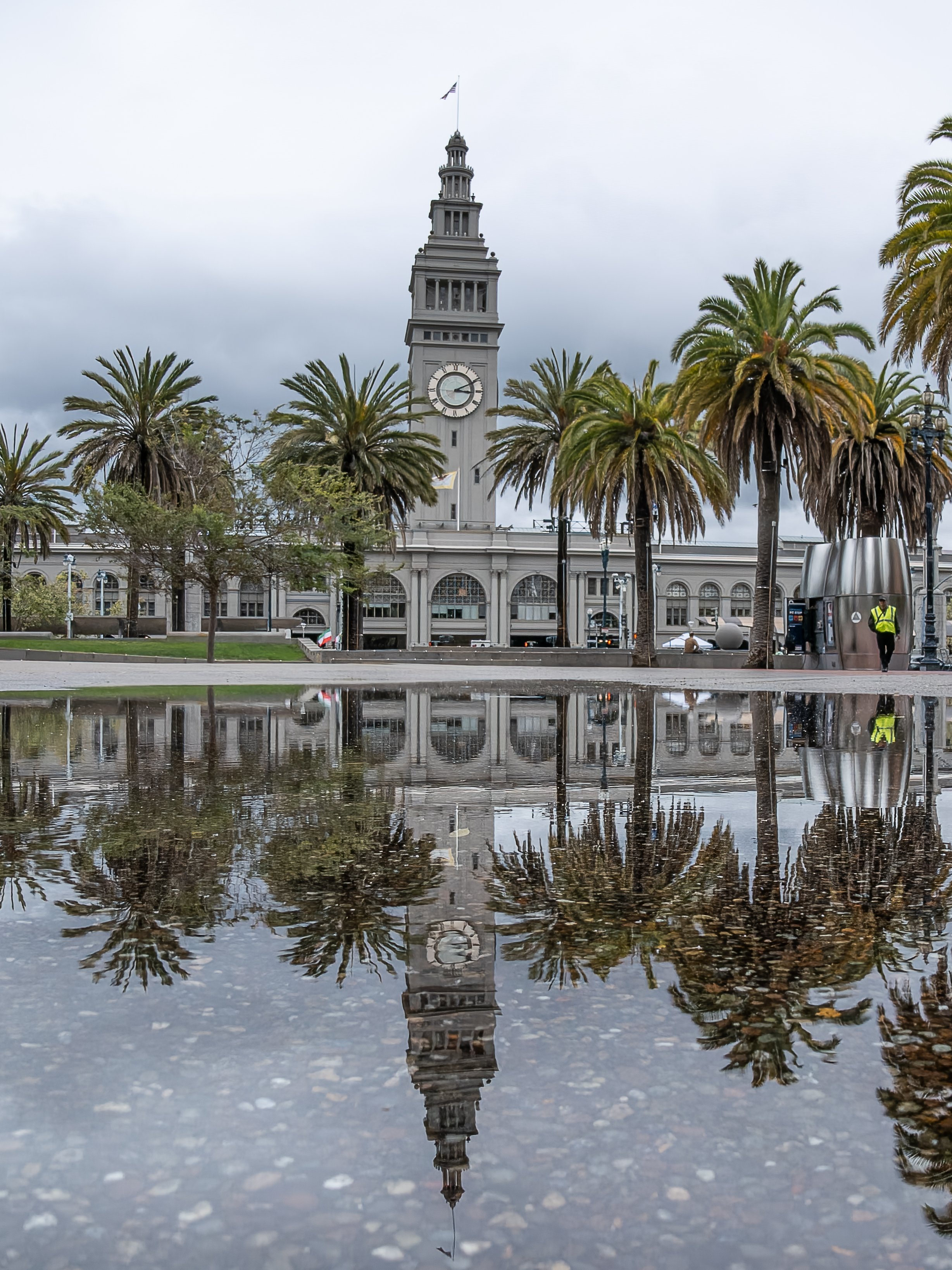 San Francisco had gotten some rain in the days before, and the Embarcadero still had puddles scattered across the pavement. One of the first shots I went for was a reflection of the Ferry Building sitting in a puddle near the waterfront. The overcast sky kept the light flat and even, which actually helped the reflection read clearly without a lot of glare competing with it. Getting low with the Ace Pro 2 was easy, no contorting myself to see a viewfinder. I just held it close to the ground and used the flip screen to frame it up.