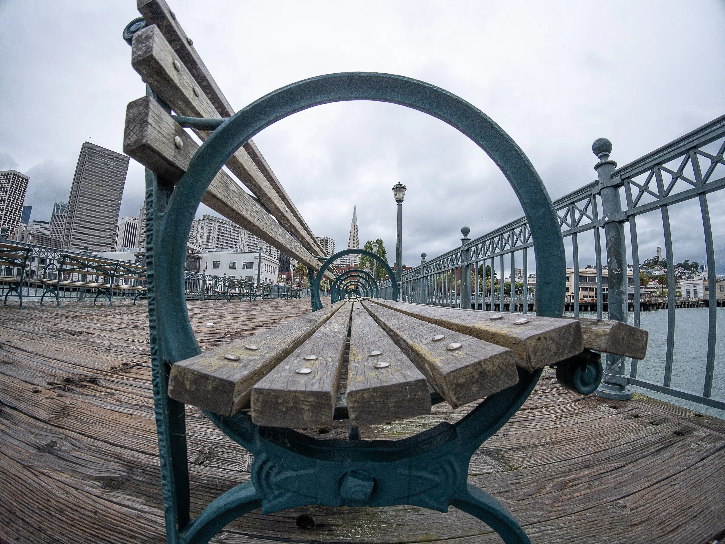 Heading over to Pier 7, the wooden benches along the pier gave me a natural framing device for the Transamerica Pyramid in the background. The gloomy sky actually worked well here. It kept the background soft and let the geometry of the benches lead your eye straight to the tower. The 157-degree lens pulled in more of the scene than I expected, which meant I had to be deliberate about where I was standing so the perspective did not get too distorted.