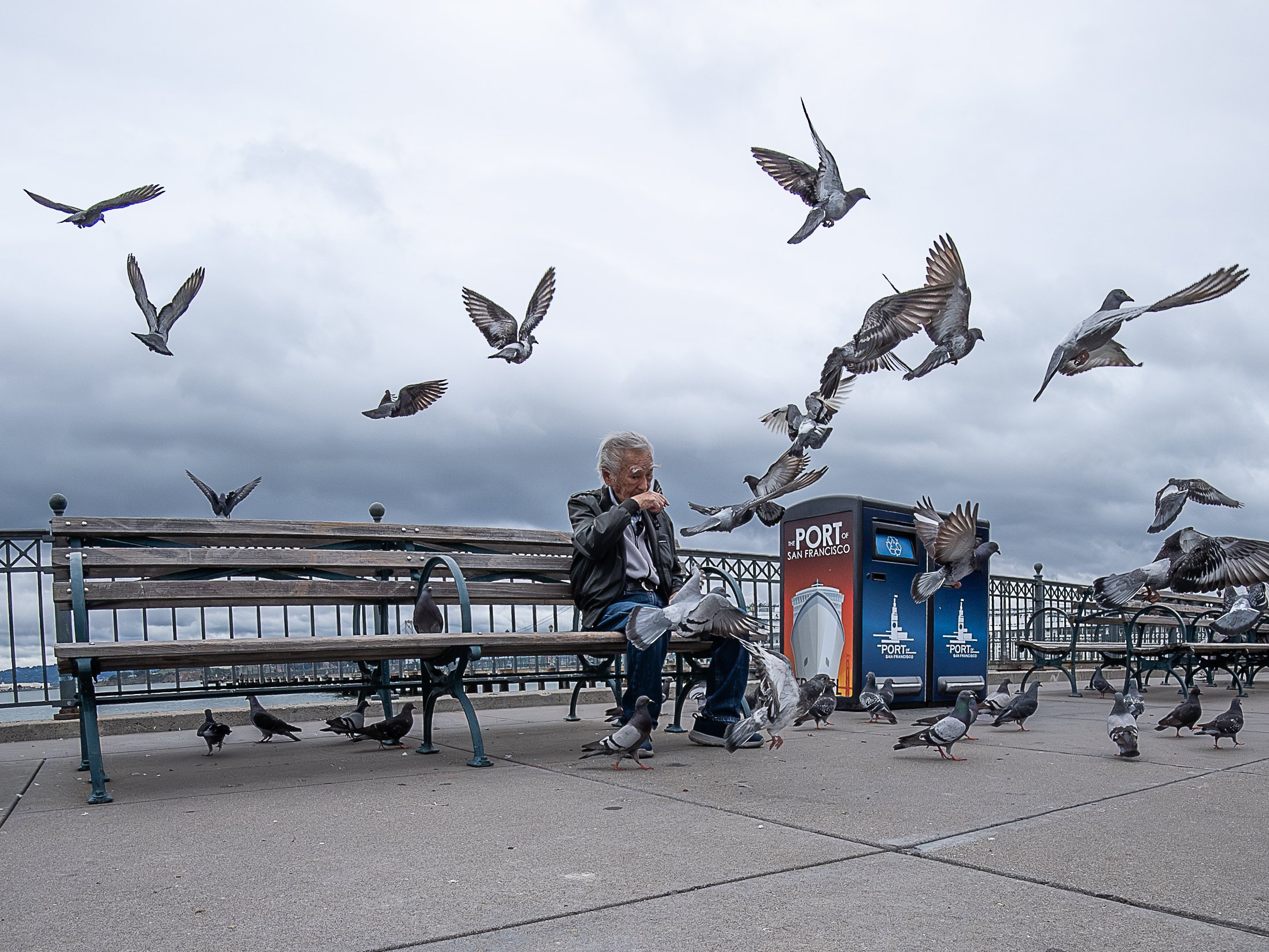 Further along, a man sitting on a bench suddenly had a small explosion of pigeons launching off the pavement right in front of him. I got lucky with the timing. The wide field of view pulled in the whole scene, birds going in every direction, and the guy mid-dodge. That is the kind of moment that is hard to plan for and easy to miss with a camera you are not comfortable with yet.