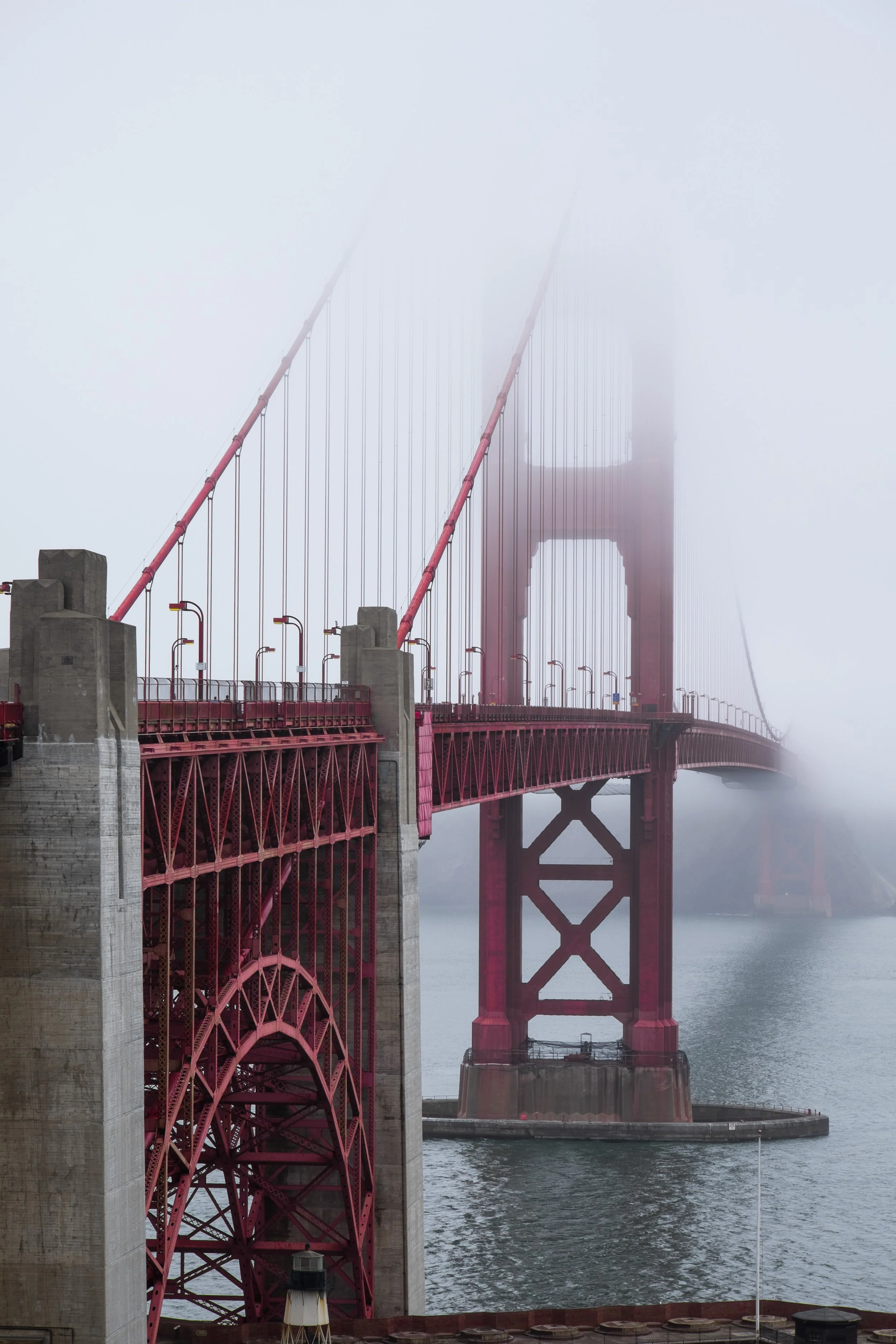 Fort Point sits directly under the south anchorage of the bridge, and there is no other location on this entire stretch that gives you quite this angle. Looking straight up at the underside of the roadway with the arch of the bridge framing the span above you is one of those compositions that never gets old. It requires a wide lens. The 16-55 at 16mm works well, and the 10-24 is even better if you want the full arch in the frame with room to breathe.