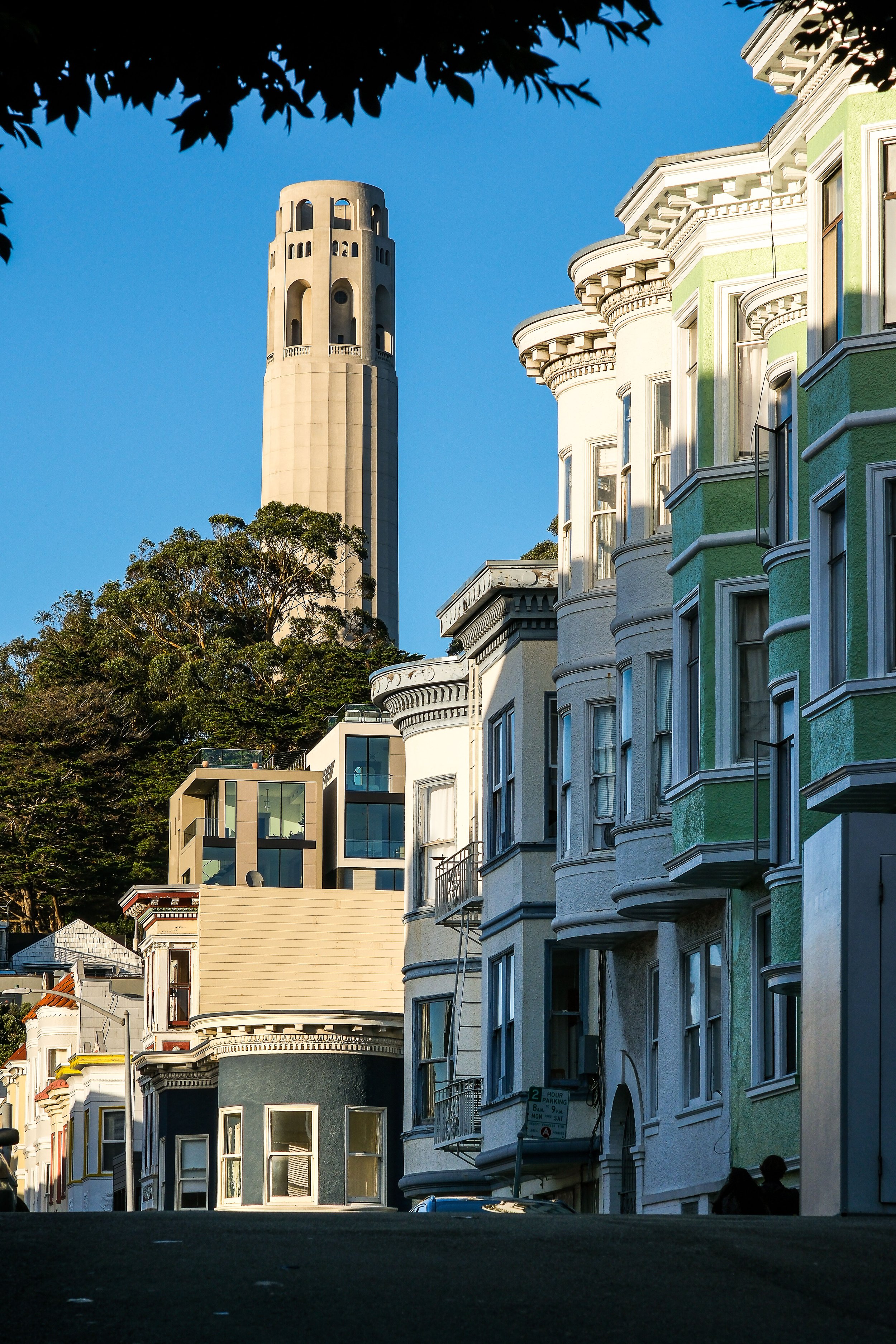 From Washington Square, head up Filbert Street toward Coit Tower. This is the climb, and I'll be honest with you: it's a workout. But the payoff is there. As you make your way up, you start getting views back over the neighborhood and the bay that are worth stopping for. Don't wait until you're at the top to start shooting.