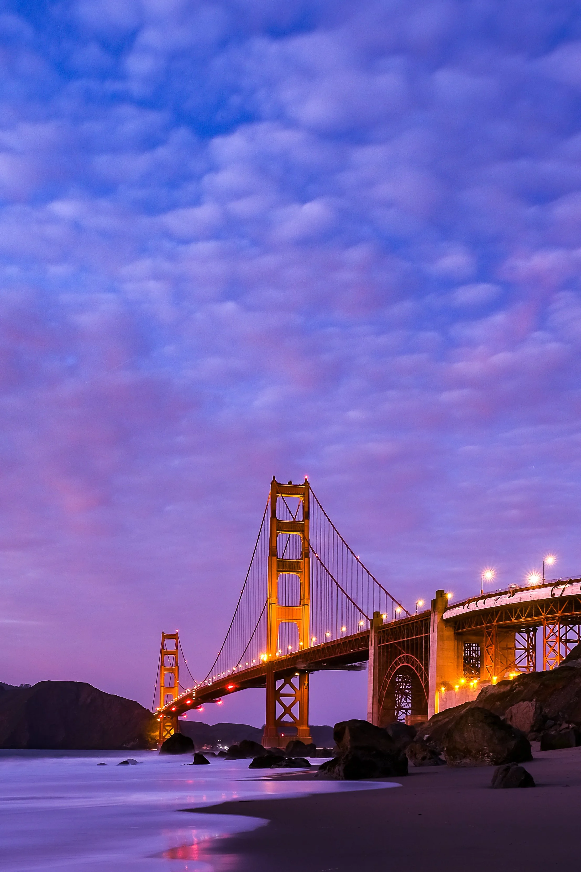 Evening golden hour is the prime time for this stretch. The sun sets over the Pacific, to the northwest, which means it throws warm directional light directly onto the south face of the bridge. The towers go from their everyday International Orange to something closer to burnished copper, and the whole scene takes on that quality where you know every frame is going to work. Stay through twilight. That 20-minute window after the sun drops, when the sky goes deep blue and the bridge lights come on, is a completely different and equally worthwhile shot.