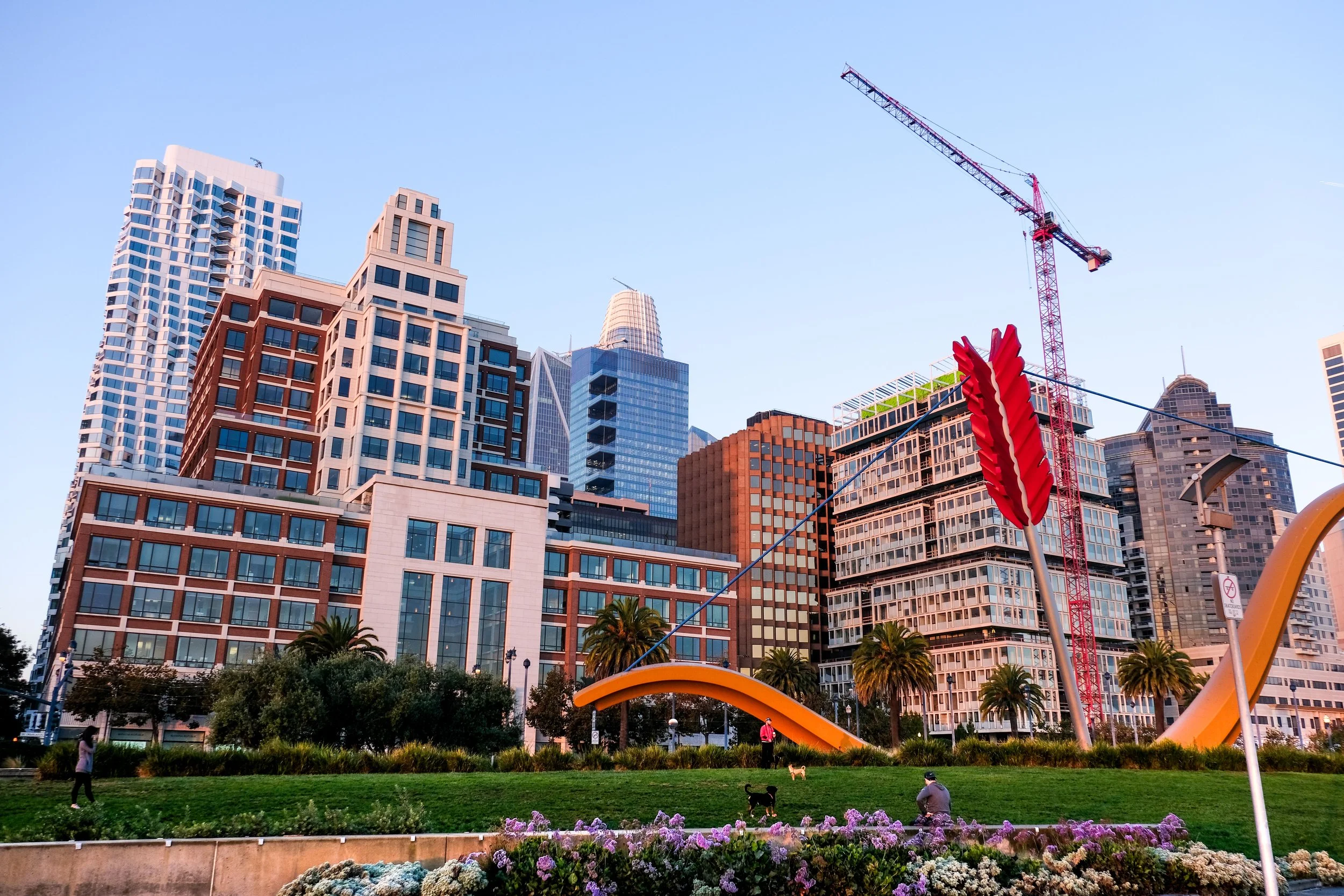 Just south of the Ferry Building at Rincon Park, the Bow and Arrow sculpture by Claes Oldenburg and Coosje van Bruggen is a great landmark to include in compositions looking back toward the Bay Bridge. But what I find more interesting is what's just off the waterfront nearby: the old wooden pilings standing in the water, remnants of the original industrial piers. These weathered pillars have real character, especially at low tide when they're fully exposed, and in the right light they make for a moody foreground element. The 70-300 is useful here too, letting you pick out individual pilings and compress them against the bridge in the background.