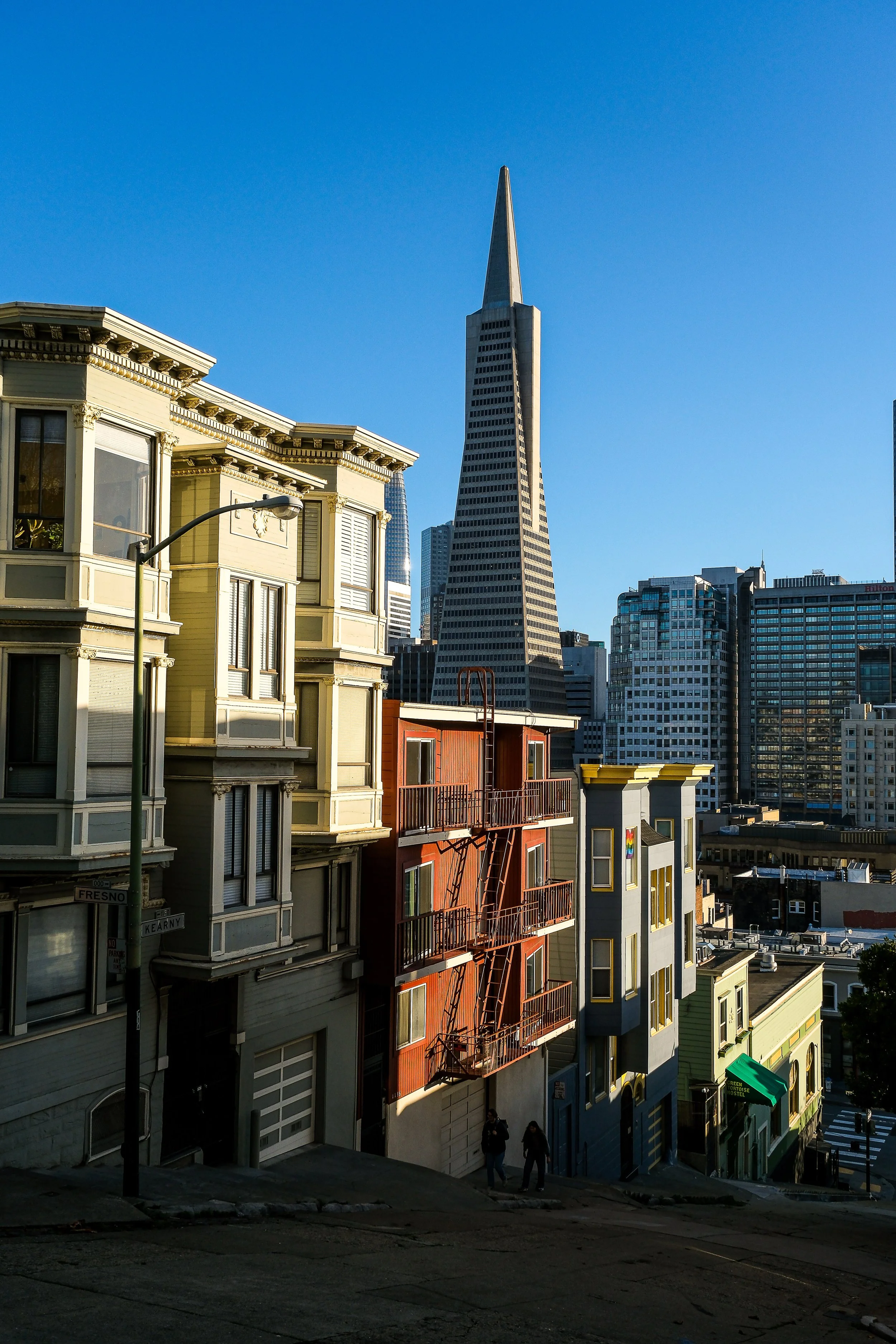 Here's my favorite hidden gem of this whole walk. As you head down Grant, make a left on Vallejo Street and walk up toward Kearny. When you hit Kearny, stop and look. What you get is a row of beautiful Edwardian buildings in the foreground with the Transamerica Pyramid rising in the background. It's a genuinely great composition and almost nobody talks about it. The Edwardians give you texture, color, and that distinctly San Francisco residential character, while the pyramid anchors the background and ties it back to the Financial District just a few blocks away.