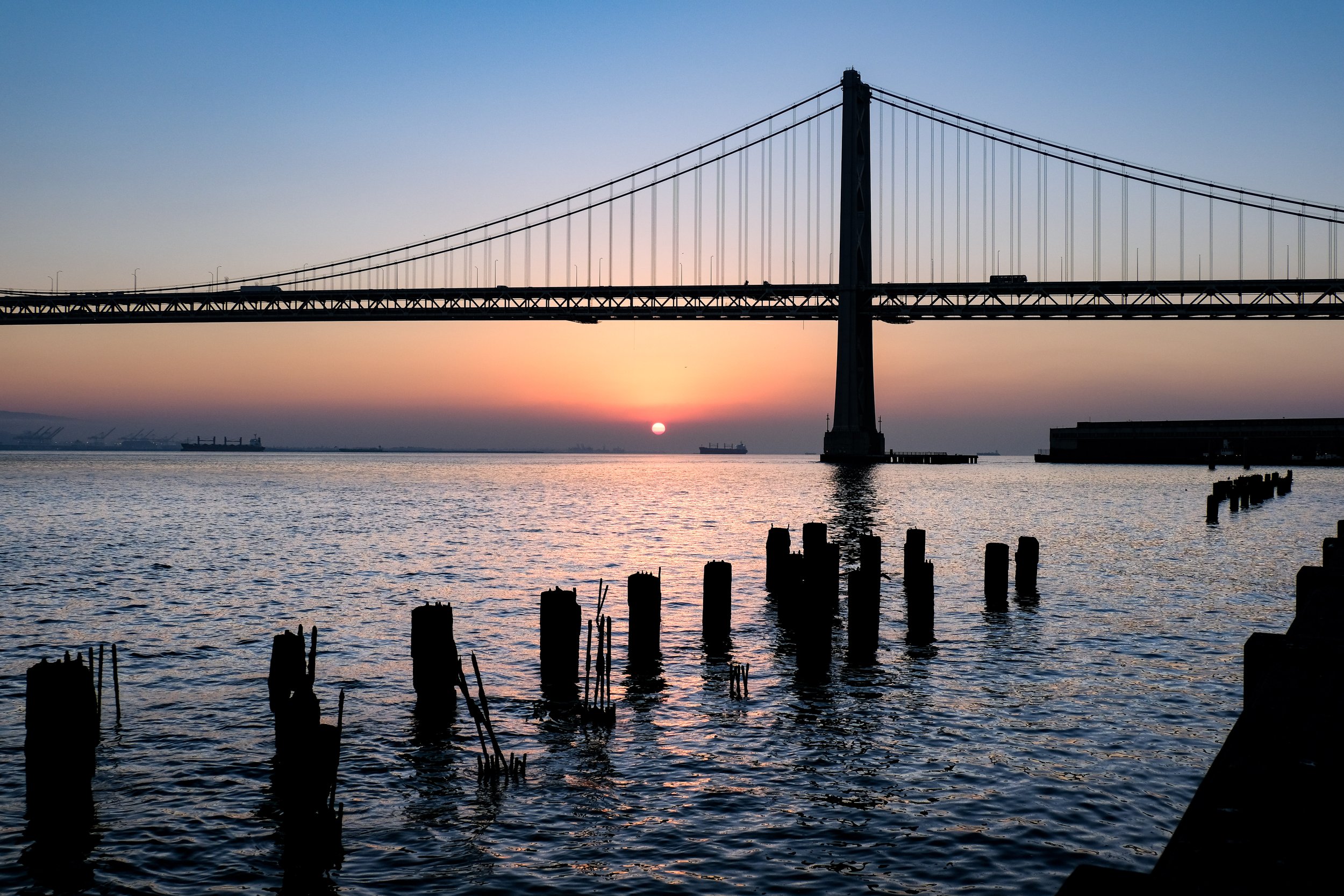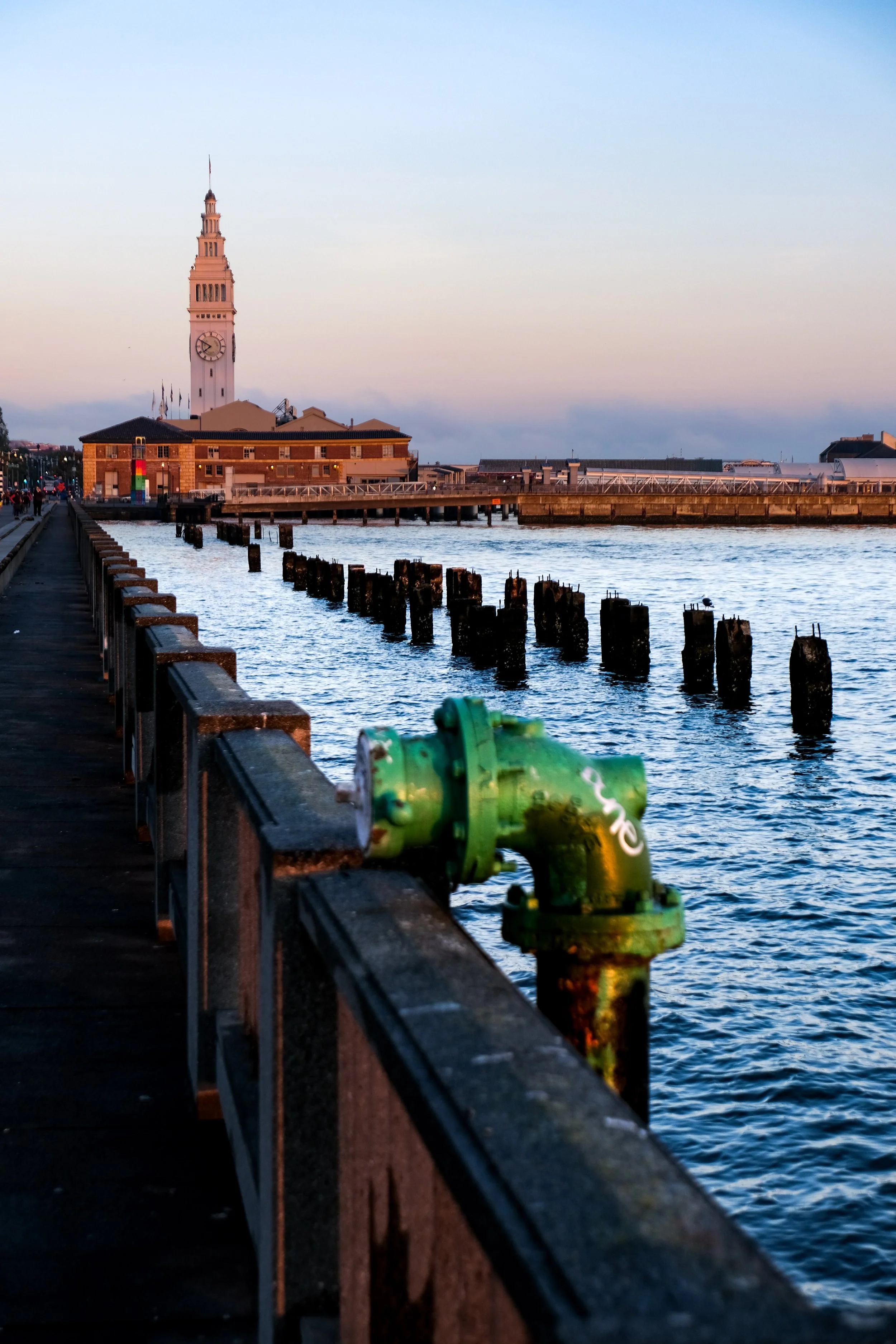 Sunrise is the call if you want the Bay Bridge. The light comes from the east and wraps around the bridge structure beautifully in the first hour after dawn. Midday light on this stretch tends to be harsh and fairly flat, though fog can rescue it. Late afternoon into golden hour is when the Ferry Building facade really glows and the whole promenade takes on that warm, inviting quality. Twilight on Pier 7 is the most reliable evening payoff.