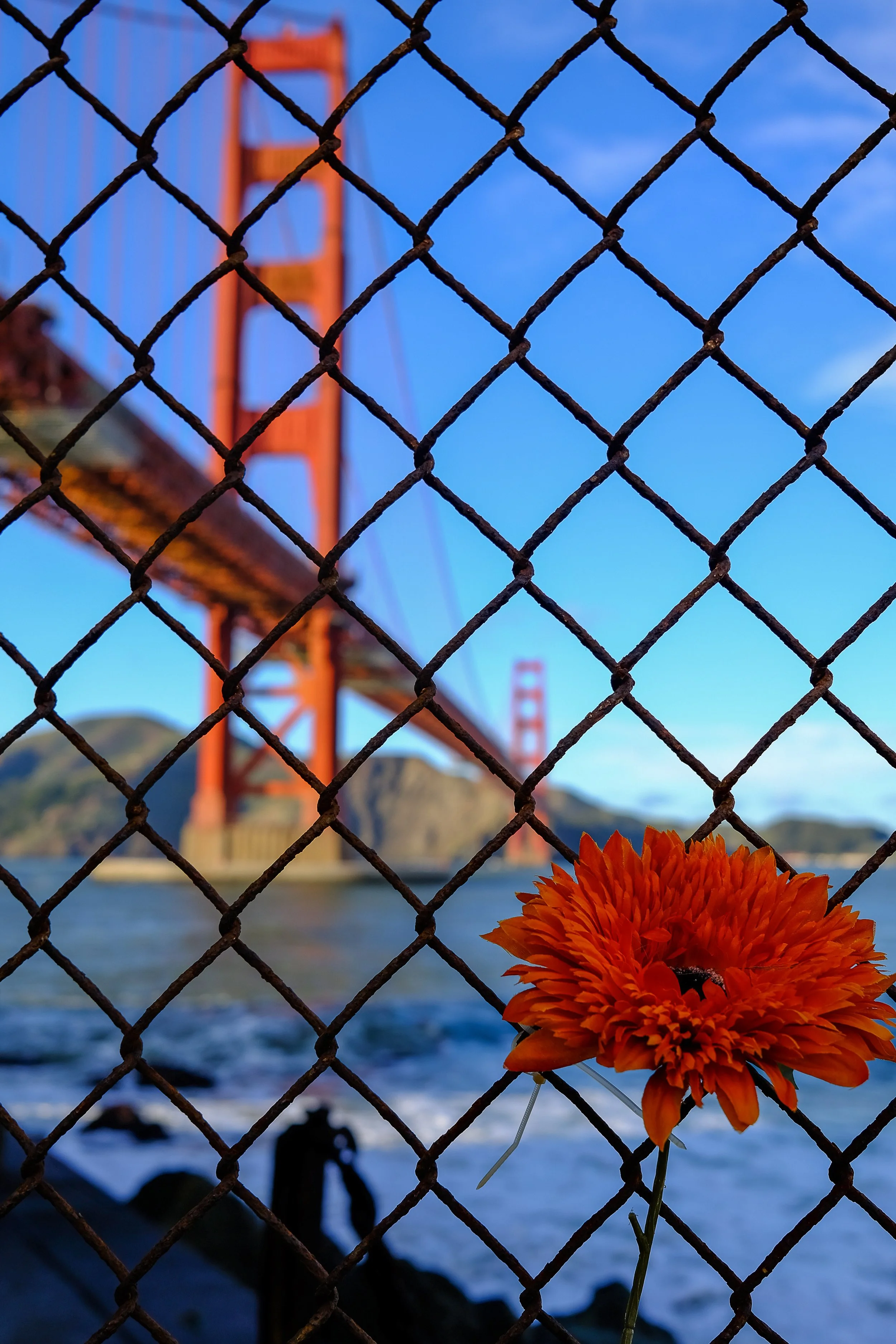 Marine Drive runs along the water between Crissy Field and the base of the bridge, and it is worth slowing down and stopping along this stretch rather than just driving through. The views of the bridge from the roadside pull-outs get progressively more dramatic as you head west toward the base. The towers start to loom over you, and the compression you get with the XF 70-300mm at the longer end starts to get really interesting here. You can isolate the cables, fill the frame with the towers, or pull the bridge together with the Marin Headlands behind it in a way that feels stacked and dramatic.