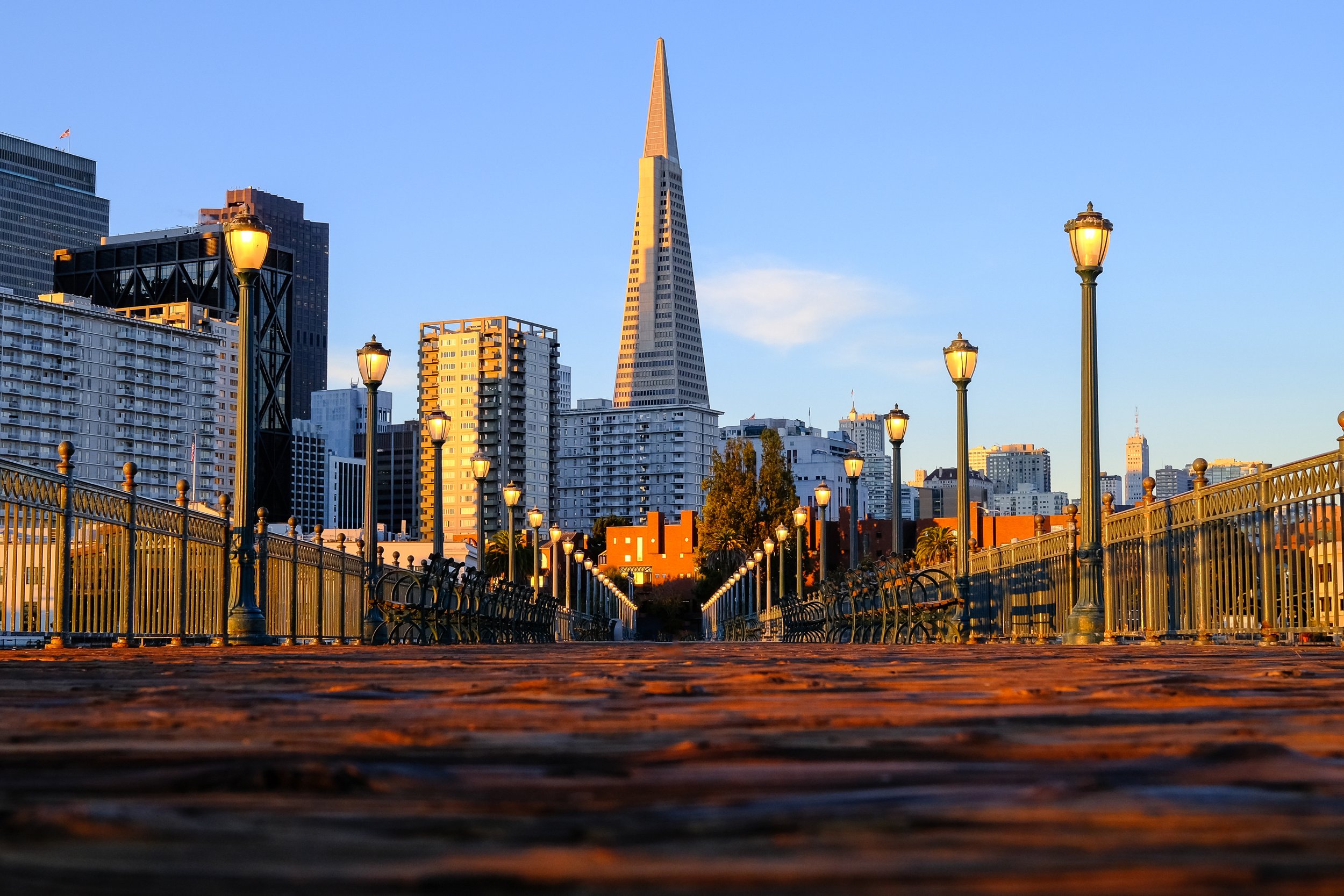 Pier 7 is a genuine gem and honestly one of the more underrated spots on this stretch. It's a public fishing pier that juts out into the Bay, which means you're shooting back toward the city with the water on all sides. The view of the Transamerica Pyramid from out here is compelling in a way you simply don't get from street level. The pyramid sits above the Financial District roofline and gives you a skyline composition that feels distinctly San Francisco.