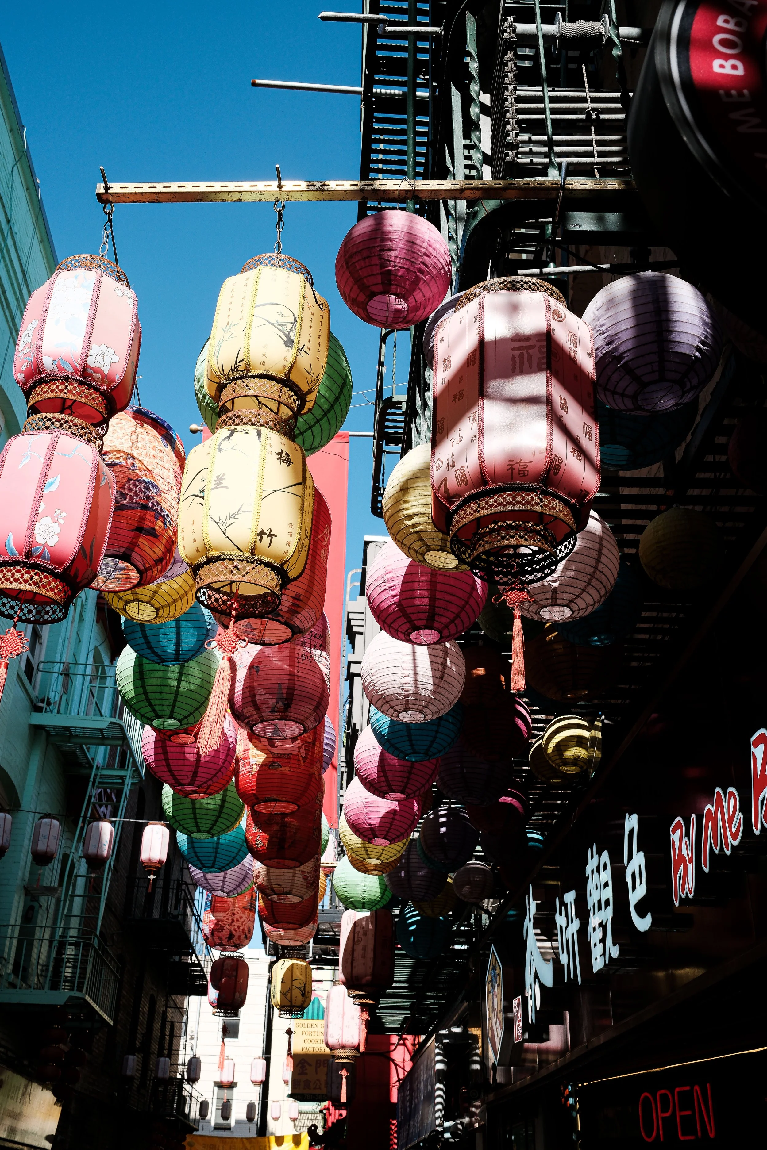 Waverly Place has a reputation as the one of the most photogenic alleys in Chinatown, and that reputation is well earned. The tong association buildings have these incredible painted balconies stacked three and four stories up, and on a clear day the color against the sky is outstanding. The alley is narrow so you're shooting up a lot, but the X100VI handles this beautifully.