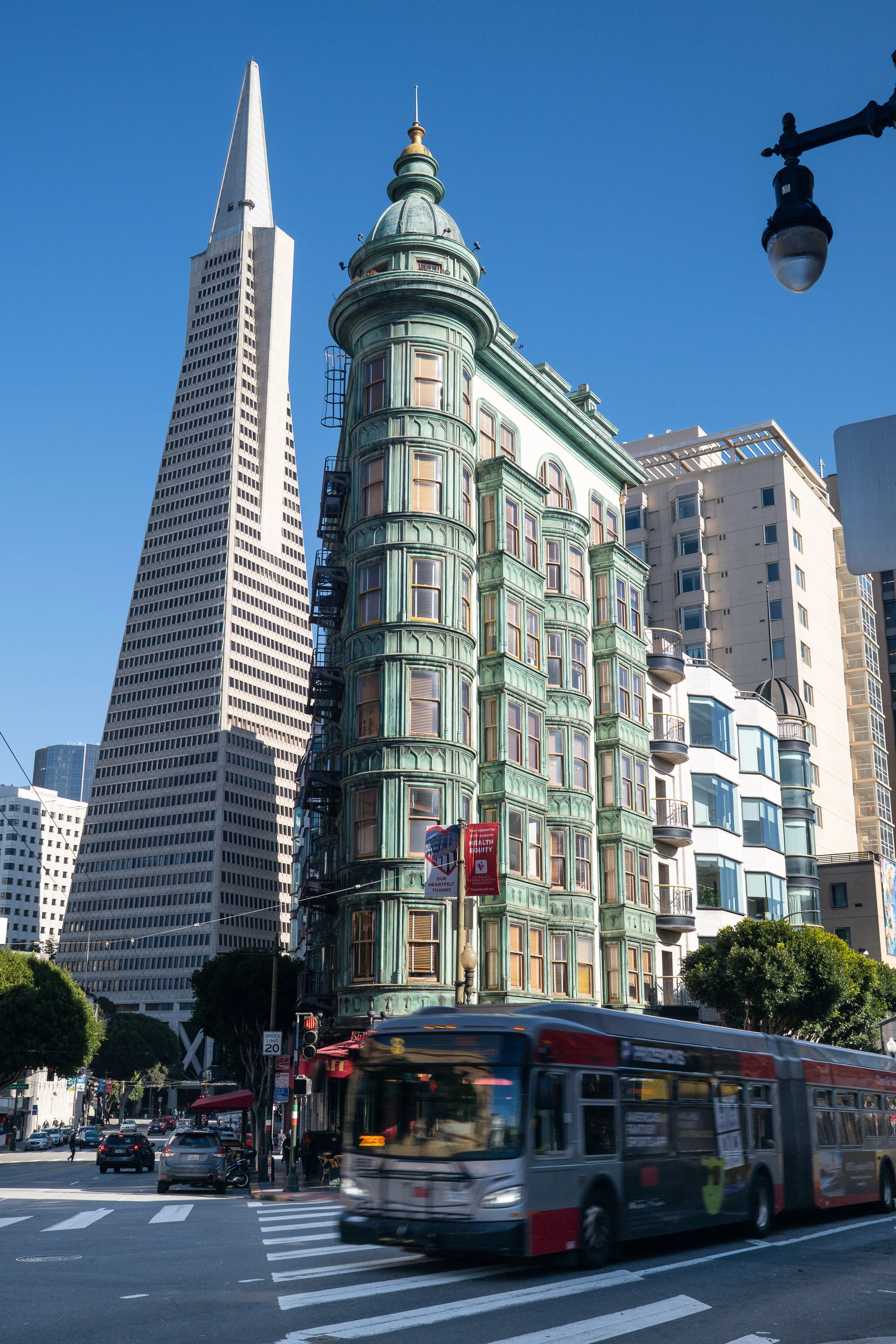 Along the way, keep an eye out for the Sentinel Building, also known as Columbus Tower, at the corner of Columbus, Kearny, and Jackson. This copper-green flatiron building survived the 1906 earthquake and has been owned by Francis Ford Coppola since the early 70s. It's a genuinely beautiful building and one of those SF landmarks that photographs well from almost any angle. The wedge shape means you get different compositions depending on which side you approach from.