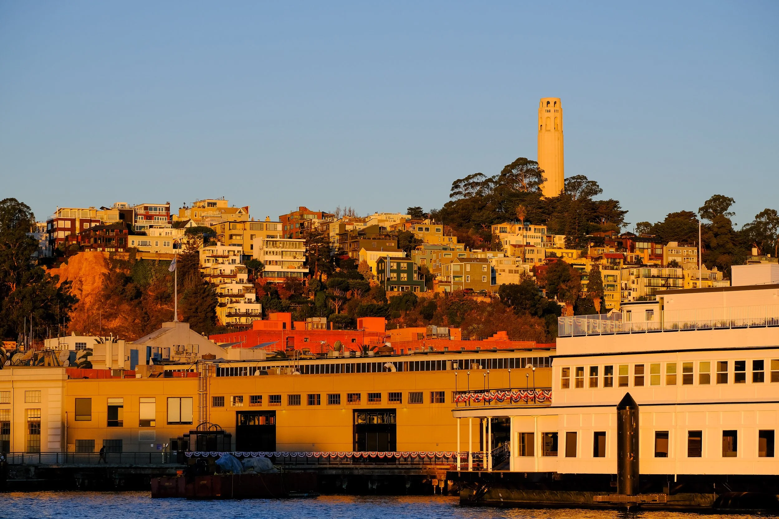 Walking north from the Ferry Building, Piers 1 and 3 give you some of the best angles back toward the clock tower and south along the waterfront. Pier 1 has been beautifully restored and the architecture itself is photogenic, particularly at golden hour when the warm light catches the brick and timber. These piers are also a good vantage point for longer focal length work, using the XF 70-300mm to compress the distance and pull the Bay Bridge closer to the frame.
