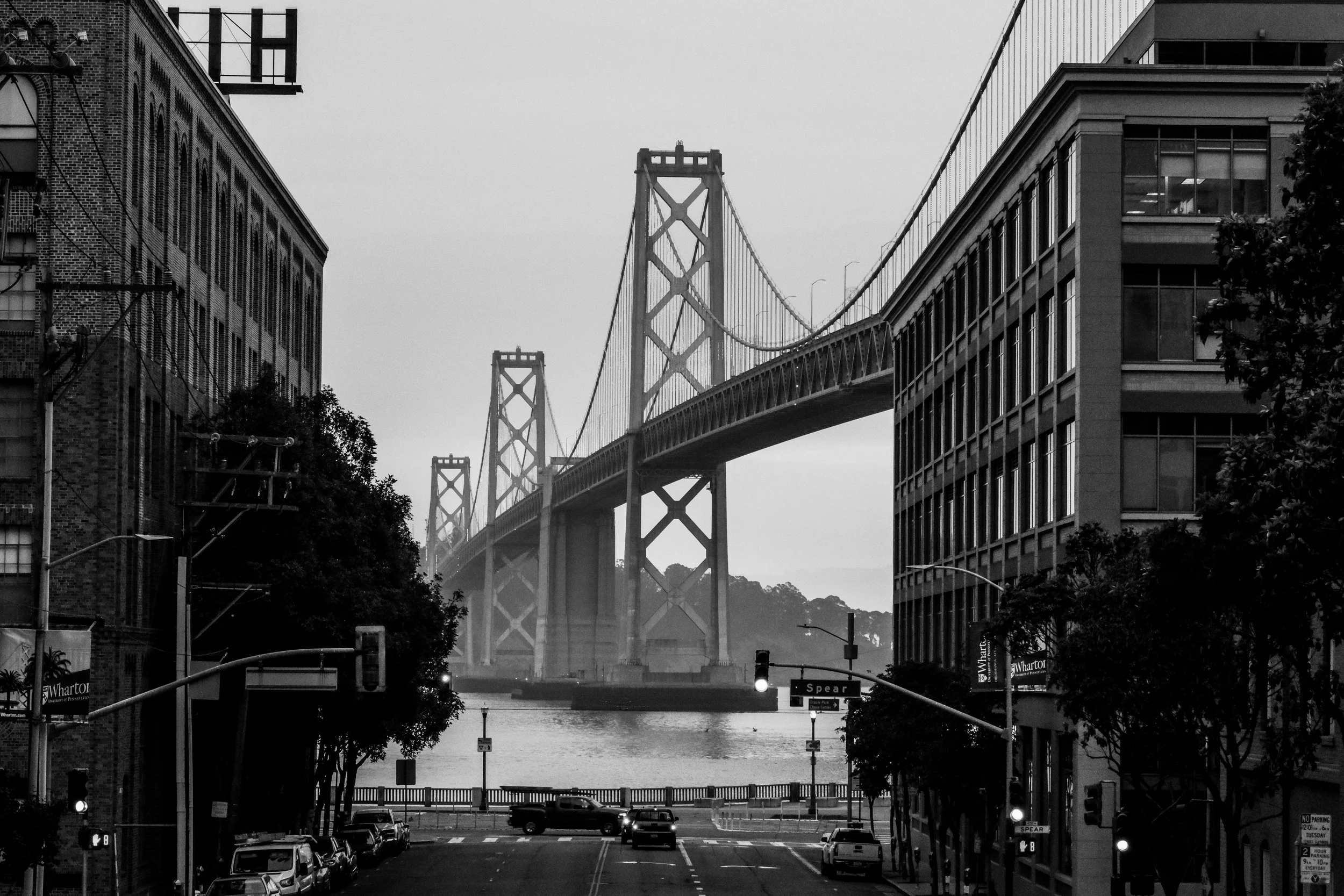 Start at Harrison Street, just south of the main Ferry Building cluster, and work your way north toward the Ferry Building. From here you get a feel for the full sweep of the Embarcadero corridor, with the palm-lined boulevard, the F-line streetcars rolling past, and the Bay Bridge anchoring the view to the east. The bridge looks especially strong from this end of the waterfront, and if you arrive around sunrise, the light hits the eastern span in a way that's worth building a whole morning around. This is where the Fuji X-T5 with the 16-55mm f/2.8 earns its keep, letting you take in the wide scene while still having enough reach to isolate architectural details.